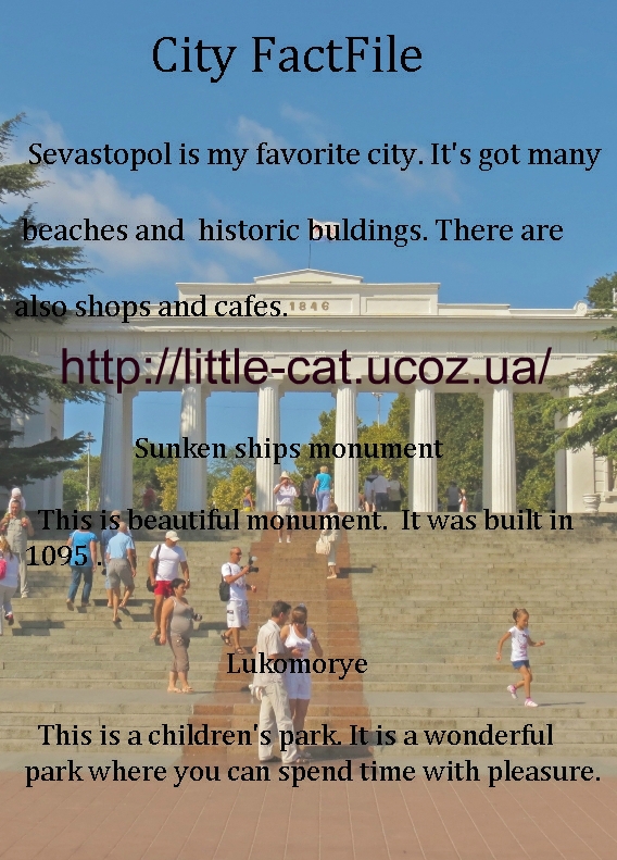 Задали сделать Project про свой город на урок английского. Надо было написать факты о Севастополе. Думаю нормально получилось:)